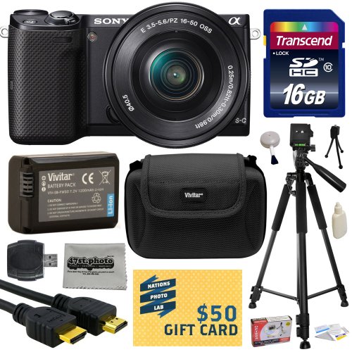 Full detail for Sony NEX5 NEX-5 NEX-5T NEX5TL NEX-5TL/B Mirrorless Compact Interchangeable Lens Digital Camera with 16-50mm Power Zoom Lens (Black) with Best Value Accessories Bundle Kit includes 16GB Class 10 SDHC Memory Card + Replacement (1200mAh) NP-FW50 Battery + Professional 60" Inch Photo/Video Tripod + Hard Shell Carrying Case + High Speed USB Reader/Writer + HDMI Cable + Camera Lens Cleaning Kit + Bonus Gift Card for Digital Prints