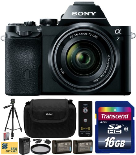 Sony a7K A7 Full-Frame DSLR 24.3 MP Interchangeable Digital Lens Camera FE 28-70mm f/3.5-5.6 OSS Lens with Beginner Accessories Bundle Kit includes 16GB Class 10 SDHC Memory Card + x2 Replacement (1200mAh) NP-FW50 Battery + Home Wall Charger with Car and European Adapter + Professional 60" Inch Photo/Video Tripod + Ultra Violet UV High Definition Filter + Hard Shell Carrying Case + Wireless Shutter Release Remote + Camera Lens Cleaning Kit + Bonus Gift Card for Digital Prints new products that have many advantages, The Alpha a7 Mirrorless Digital Camera with FE 28-70mm f/3.5-5.6 OSS Lens from Sony incorporates a full-frame Exmor CMOS sensor into an E-mount body thus providing the light gathering capability and detail-rich imaging of a full-frame sensor with a compact, lightweight and versatile mirrorless interchangeable lens camera system. The 24.3MP sensor enables high resolution images and low light effectiveness with its standard ISO sensitivity range of 100-25600. The new BIONX X image processor offers fast processing and operation speeds such as 5 fps burst shooting and front-end LSI (large-scale integration) improves the early stages of image processing resulting in more natural details and richer tones. 14-bit RAW output preserves the detail provided by the sensor.